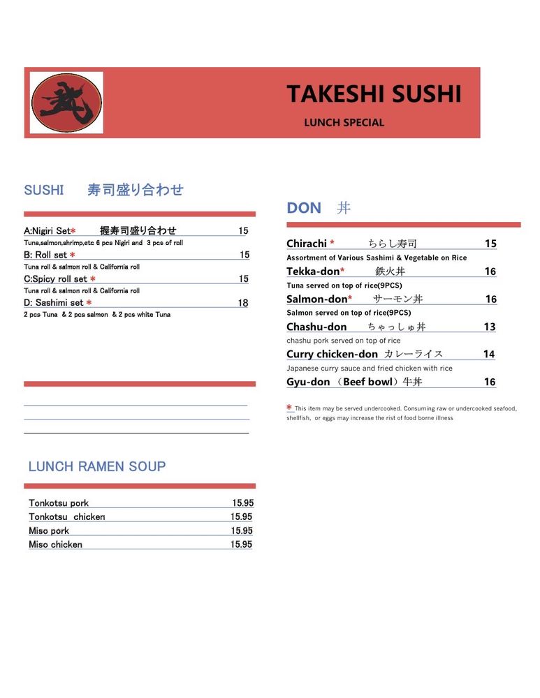 Takeshi Sushi, located in Arlington, VA, offers a variety of lunch specials featuring sushi and ramen. The menu includes Nigiri Set Lunch Special, Roll Set Lunch Special, and Spicy Roll Set Lunch Special for sushi lovers, along with options like Hiyayakko, Shumai, and Gyoza for appetizers. Customers praise the fresh fish and superb sushi, with reasonable prices making it a go-to spot for many. The cozy ambiance and friendly staff add to the overall dining experience. Dishes like the potato shrimp tempura and salmon lover receive high praise for their taste and value. While some customers note minor service issues, the overall consensus is positive, with many planning return visits. If you're craving delicious, budget-friendly sushi and ramen, Takeshi Sushi is a must-try destination.